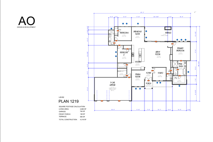 Plan 1219 is a spacious and elegant single-story custom home offering a balanced blend of comfort, practicality, and refined design. With a three-car garage, expansive open-concept living areas, and a dedicated office studio, this fully permit-ready home is perfect for families, professionals, or those who love effortless, single-level living.